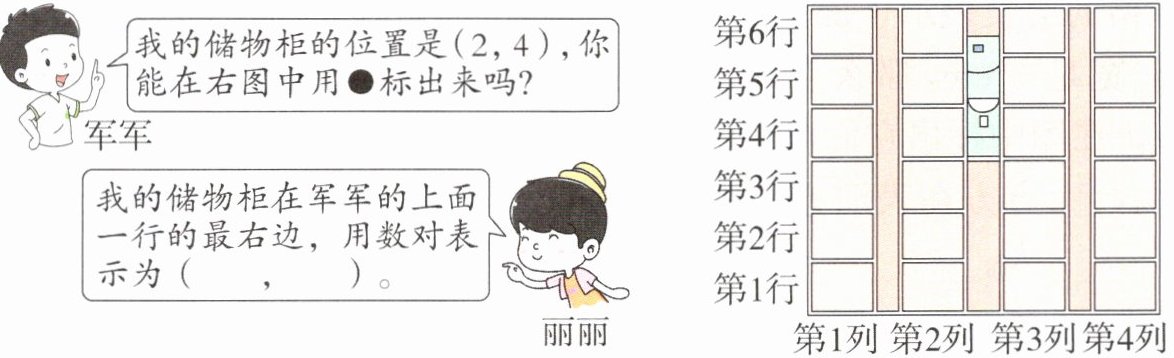 (1)芳芳的储物柜与军军的在同一行,与丽丽在同一列,用数对表示是( , ),并在图中用▲标出来。
