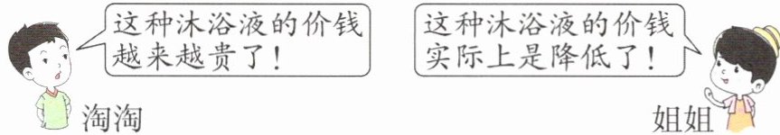 6.(说理表达)淘淘和姐姐在逛超市的时候发现,一种沐浴液的质量从每瓶500g增加到每瓶600g,而这种沐浴液的售价也从原来的每瓶27元增加到每瓶30元。下面谁的说法是正确的?请写出你的观点和理由。