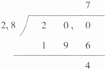 4. (说理表达)甜甜打算将一根20m长的彩带,剪成2.8m长的小段,甜甜为了计算能剪多少根2.8m长的小段,列出了如下竖式,甜甜认为剪完后还能剩下4m彩带。请你先观察竖式,再判断甜甜说得对不对,并说明理由。