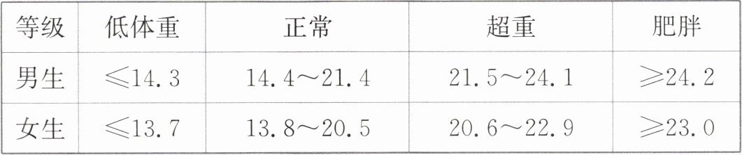 $BMI=$体重$÷$(身高$×$身高)(体重以“kg”为单位,身高以“m”为单位)