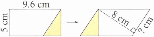 3. 强强把一张长9.6 cm、宽5 cm的长方形纸剪拼成一个平行四边形(如图),量得这个平行四边形的一条高为8 cm,请你计算出这条高所对应的底是多少厘米。