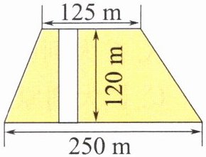 3. (绍兴真题)某农业园区有一块梯形稻田(如右图),因需要被一条宽 $2.5m$ 的小路分成两部分。修路后,这块稻田的实际面积是多少? 如果一台收割机每分钟收割 $240m^{2}$,那么收割完这块稻田需要多长时间?