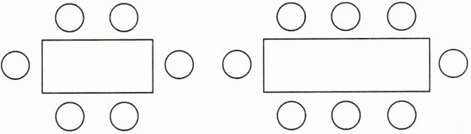 10. [新探究]某校图书馆中有如图两种桌子,一种桌子的长是宽的2倍,可安排6个座位,有3张;另一种桌子的长是宽的3倍,可安排8个座位,有2张。把5张桌子拼成一个无缝隙的长方形大桌子,有哪些不同的拼法,可以坐几个人?画出拼好的图,并写出可以坐的人数。