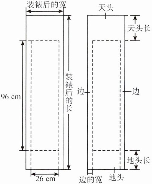 8. [新情境]对联是中华传统文化的瑰宝,对联装裱后,如图所示,上、下空白处分别称为天头和地头,左、右空白处统称为边。一般情况下,天头长与地头长的比是6:4,左、右边的宽相等,均为天头长与地头长的和的1/10。某人要装裱一副对联,对联的长为96cm,宽为26cm。若要求装裱后的长是装裱后的宽的4倍,求边的宽和天头长。