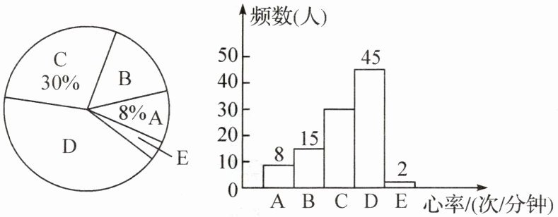 1. (2023 山东中考)某班学生以跨学科主题学习为载体,综合运用体育,数学,生物学等知识,研究体育课的运动负荷,在体育课基本部分运动后,测量统计了部分学生的心率情况,按心率次数 $ x $ (次/分钟)分为如下五组:A 组:$ 50 \leqslant x<75 $,B 组:$ 75 \leqslant x<100 $,C 组:$ 100 \leqslant x<125 $,D 组:$ 125 \leqslant x<150 $,E 组:$ 150 \leqslant x \leqslant 175 $.其中,A 组数据为 73,65,74,68,74,70,66,56. 根据统计数据绘制了不完整的统计图(如图所示),请结合统计图解答下列问题: