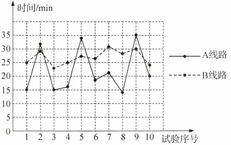 2. 小红家到学校有两条公共汽车线路,为了解两条线路的乘车所用时间,小红做了试验,第一周(5天)选择 A 线路,第二周(5天)选择 B 线路,每天在固定时间段内乘车 2 次并分别记录所用时间(单位:min),数据统计如下: