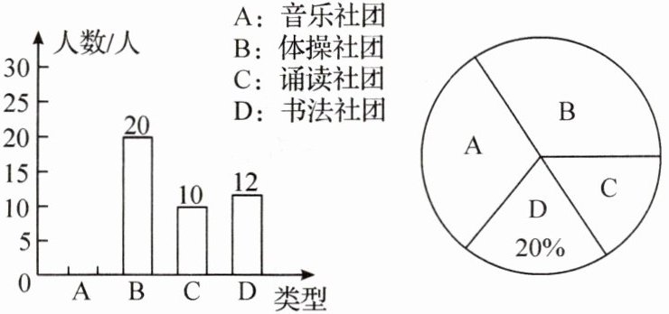 3. (2024黑龙江绥化中考)为了落实国家“双减”政策,某中学在课后服务时间里,开展了音乐、体操、诵读、书法四项社团活动。为了了解七年级学生对社团活动的喜爱情况,该校从七年级全体学生中随机抽取了部分学生进行“你最喜欢哪一项社团活动”的问卷调查,每人必须选择一项社团活动(且只能选择一项)。根据调查结果,绘制成如下两幅统计图。