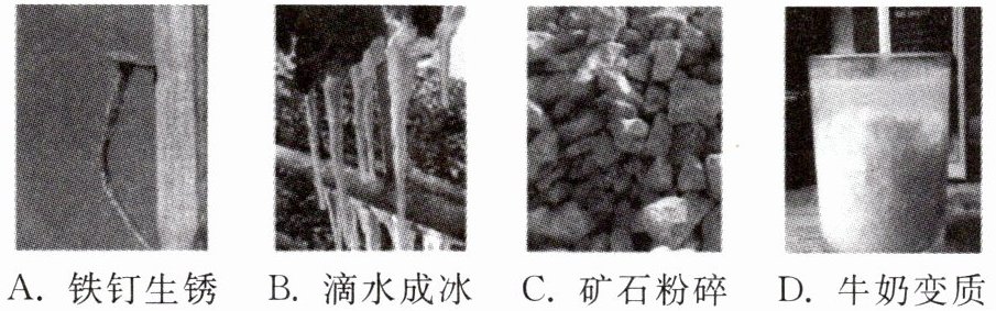 2. (2024甘肃临夏中考)物理变化和化学变化的区别在于是否有新物质的生成。某学习小组在延时课上制作了A,B,C,D四张卡片,四张卡片除图片内容不同外,其他没有区别,放置于暗箱中摇匀。