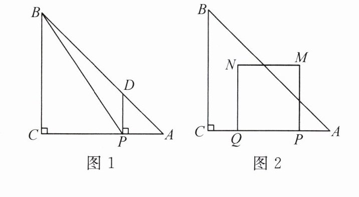 (3)如图2,点Q在射线PC上,且PQ= 2AP,以线段PQ为边向PQ上方作正方形PQNM。在运动过程中,若设正方形PQNM与△ABC重叠部分的面积为8,求t的值。