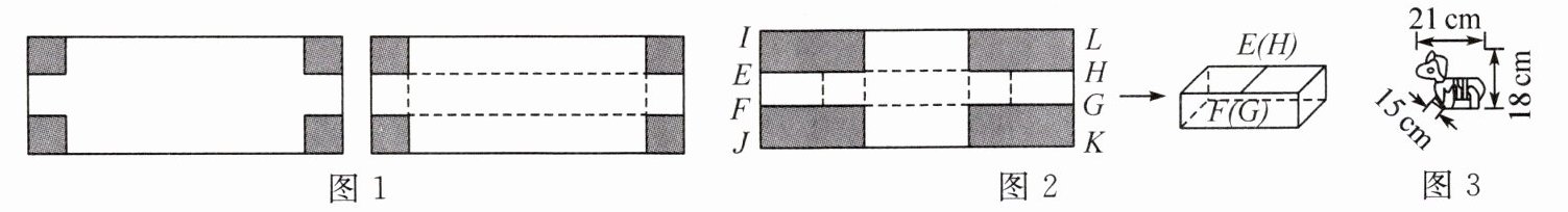 任务二: 设计有盖长方体收纳盒. 把另一块长方形硬纸板的四角剪去四个相同的小长方形, 然后折成一个有盖的长方体收纳盒, $ EF $ 和 $ HG $ 两边恰好重合且无重叠部分, 如图 2.