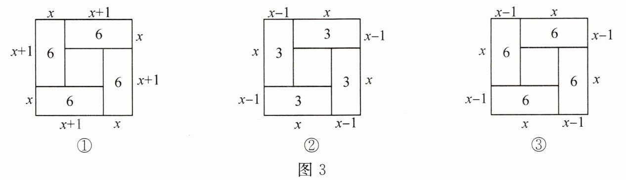 在图 3 的三个构图中, 能体现方程 $ x ^ { 2 } - x - 6 = 0 $ 的解法的是____(填序号), 观察图形可知 $ ( 2 x - 1 ) ^ { 2 } = $____;