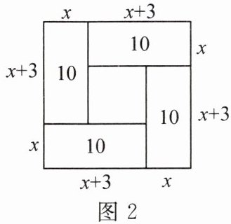 第三步: 如图 2, 用四个这样的长方形围成一个大正方形, 中间空白部分恰好是一个小正方形. 则大正方形的边长为 $ 2 x + 3 $, 小正方形的边长为 3;