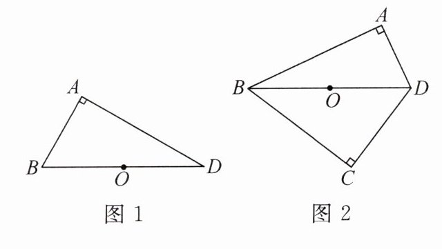 如图2,在$Rt\triangle ABD和Rt\triangle BCD$中,O为BD的中点,求证:点A、B、C、D在以点O为圆心的同一个圆上.