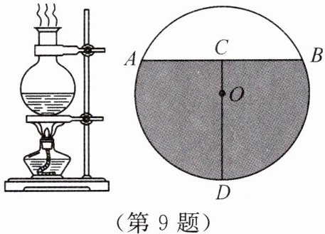 9. (2025云南玉溪期末)如图,有一个底部呈球形的烧瓶,球的半径为5cm,瓶内液体已经过半,截面圆中弦AB的长为$2\sqrt{21}cm$,则最大深度CD的长为______