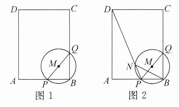 (3)如图2,连接$PD$,交$\odot M于点N$,当$\angle APD = \angle NBQ$时,求$t$的值。
