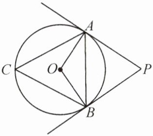 12. [教材改编]如图,$\odot O的半径是4$,$PA$、$PB分别与\odot O相切于点A$、$B$,若$PA与PB之间的夹角\angle APB = 60^{\circ}$。