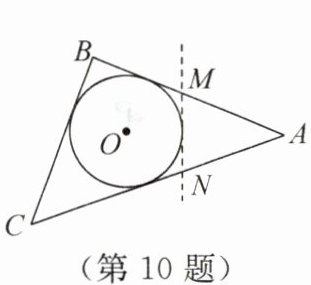 10. 如图,$\triangle ABC是一张周长为21cm$的三角形纸片,$BC = 6cm$,$\odot O$是它的内切圆,小高准备用剪刀在$\odot O的右侧沿着与\odot O相切的任意一条直线MN剪下\triangle AMN$,则剪下的三角形的周长为