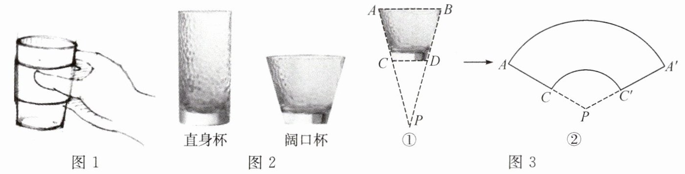 1. 如图1,商家销售某些饮品时会给杯子在杯身上套上一个杯套,方便拿取。小欣同学深受启发,准备为家中如图2所示的两种玻璃杯也配上杯套。(说明:整个探究过程中均忽略杯套的连接部分和杯套的厚度)