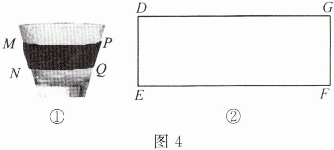 ②现有一张矩形杯套材料,如图4②所示,DE= 7.5cm,EF= 12$\sqrt{3}$cm,为了充分利用材料,请在图4②的矩形中画出杯套侧面展开示意图(杯套示意图无拼接),并直接写出用该材料制作此阔口杯套的母线MN的最大长度。