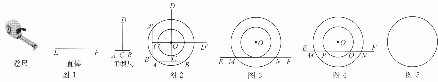2. (2025广东广州期末)在一次数学活动课中,某数学小组探究求环形花坛(同心圆)面积的方法。现有以下工具(图1):①卷尺;②直棒EF;③T型尺(CD所在的直线垂直平分线段AB)。