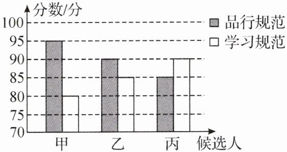 3. 某校德育处组织三好学生评比活动,每班只有一个名额. 现某班有甲、乙、丙三名学生参与竞选,根据“品行规范”“学习规范”进行量化考核,成绩(单位:分)统计如图所示. 若“品行规范”“学习规范”考核成绩均不低于三名学生的平均分的学生,才能被推选为三好学生,请通过计算判断应推选谁?
