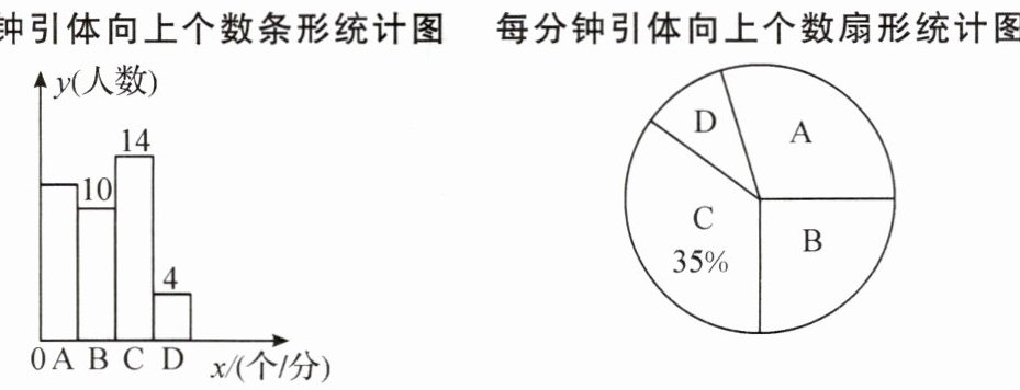 解:从 A,B,C,D 组人数来看,最中间的两个数据是第20,21 个,中位数落在 B 组,说明 B 组靠后的成绩处于中等水平;由于统计图中没有具体体现学生引体向上的训练成绩,只给出训练成绩的范围,无法计算出训练成绩的众数和平均数.