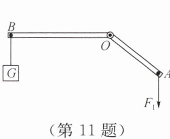 11. 如图所示,杠杆AOB保持静止,O为支点,请作出动力$F_{1}的力臂l_{1}和阻力F_{2}$.