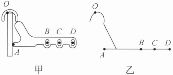 13. 如图甲为晾晒架,挂衣服时可以把它看成杠杆,图乙为其简化示意图.请在图乙中作出:(1) 当挂较重的衣物时,为了使晾晒架A点受到的支持力最小,请在B、C、D三点中选择一点,作出该点所受到的拉力$F_{2}$.(2) 晾晒架A点受到的支持力$F_{1}及其力臂l_{1}$.