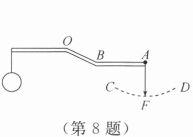 8. 如图所示为一可绕$O$点转动的杠杆,在$A点通过绳作用一竖直向下的拉力F$使杠杆平衡,此时$AB$部分水平,保持重物静止不动,而使绳绕$A点从如图所示的位置沿图中的虚线CD$转动,则 (