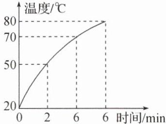 解:(1)煤完全燃烧放出的热量 Qₐₙ = mₘₑₐₗ qₘₑₐₗ = 0.2 kg×3×10⁷ J/kg = 6×10⁶ J. (2)水吸收的热量 Qₐₙ = Qₐₙ η = 6×10⁶ J×42% = 2.52×10⁶ J. (3)由图可知,在 6 min 内水升高的温度 Δt = t - t₀ = 80 °C - 20 °C = 60 °C,煤炉中水的质量 mᵥₐₜₑᵣ = Qₐₙ/(cᵥₐₜₑᵣ Δt) = 2.52×10⁶ J/(4.2×10³ J/(kg·°C)×60 °C) = 10 kg.