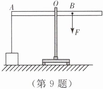 9. 如图所示,轻质杠杆可以绕 O 点转动,$OA:OB= 3:1$,在杠杆 A 点用细线挂一重力为 300 N 的物体,在杠杆 B 点施加一竖直向下的拉力 F,物体静止在水平地面上且杠杆保持水平位置平衡.此时物体对水平地面的压力为 100 N,则细线对物体的拉力为