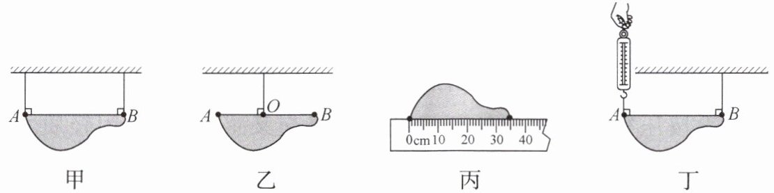 10. (2023·四川泸州·统考中考真题)小明有一件重约 15 N 的工艺品,用细线悬挂两端点 A、B 处于静止状态,如图甲所示.他想用平衡的知识,通过计算在 A、B 连线上找出 O 点的位置,以便用一根细线系在 O 点将工艺品悬挂起来,静止时如图乙所示,并计算出工艺品的重力.小明身边只有一把弹簧测力计(0 ~ 10 N)、一把刻度尺和若干细线,他设计了如下实验,请完成以下实验步骤: