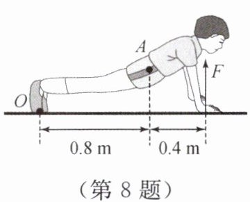 8. 如图所示,小明正在做俯卧撑,把他的身体看作一个杠杆,O 为支点,A 为重心,他的体重为 600 N.此时地面对手的支持力 F 的力臂是
