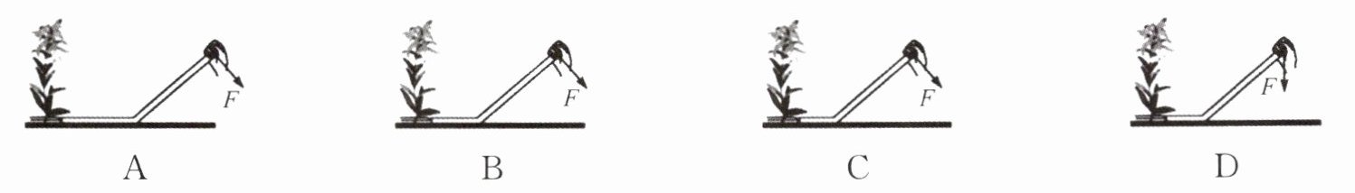7. 为了拔除外来入侵物种“一枝黄花”,农业专家自制轻质拔草器.将拔草器左下端的叉子插入植株根部,用手对拔草器施力,可将植株连根拔起.若拔同一植株,下列手施力最小的是 (