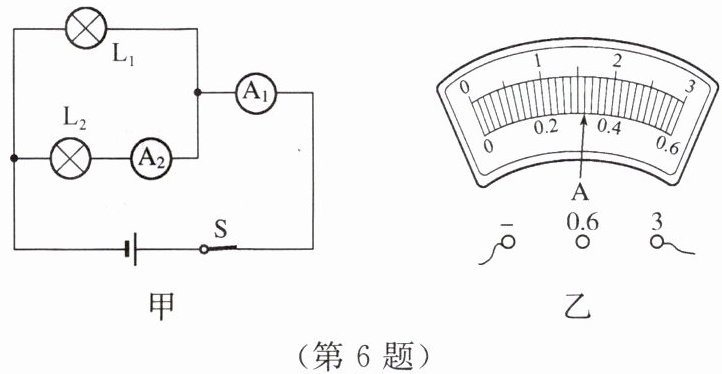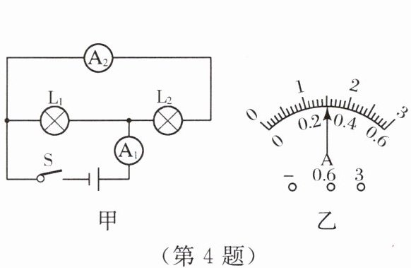 4. 如图甲所示的电路,闭合开关S后,两个灯泡都能发光,图乙为电流表$A_{1}$指针的位置.若电流表$A_{2}$的读数是0.6A,则下列说法错误的是 (