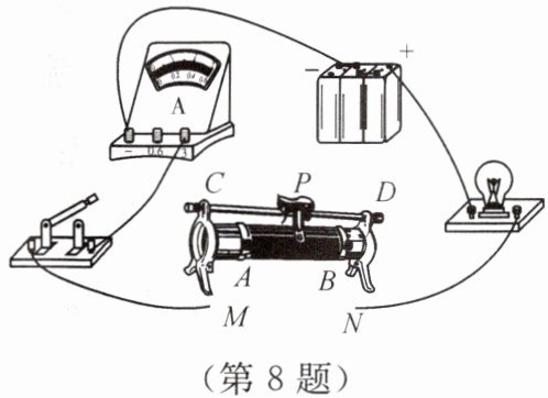 8. 如图所示是小红在“练习使用滑动变阻器”的实验中连接的部分电路, 当她将滑动变阻器连入电路后发现, 灯泡的亮度很暗, 移动滑动变阻器的滑片, 灯泡的亮度不变. 她接入滑动变阻器的方法应该是下列选项中的 (