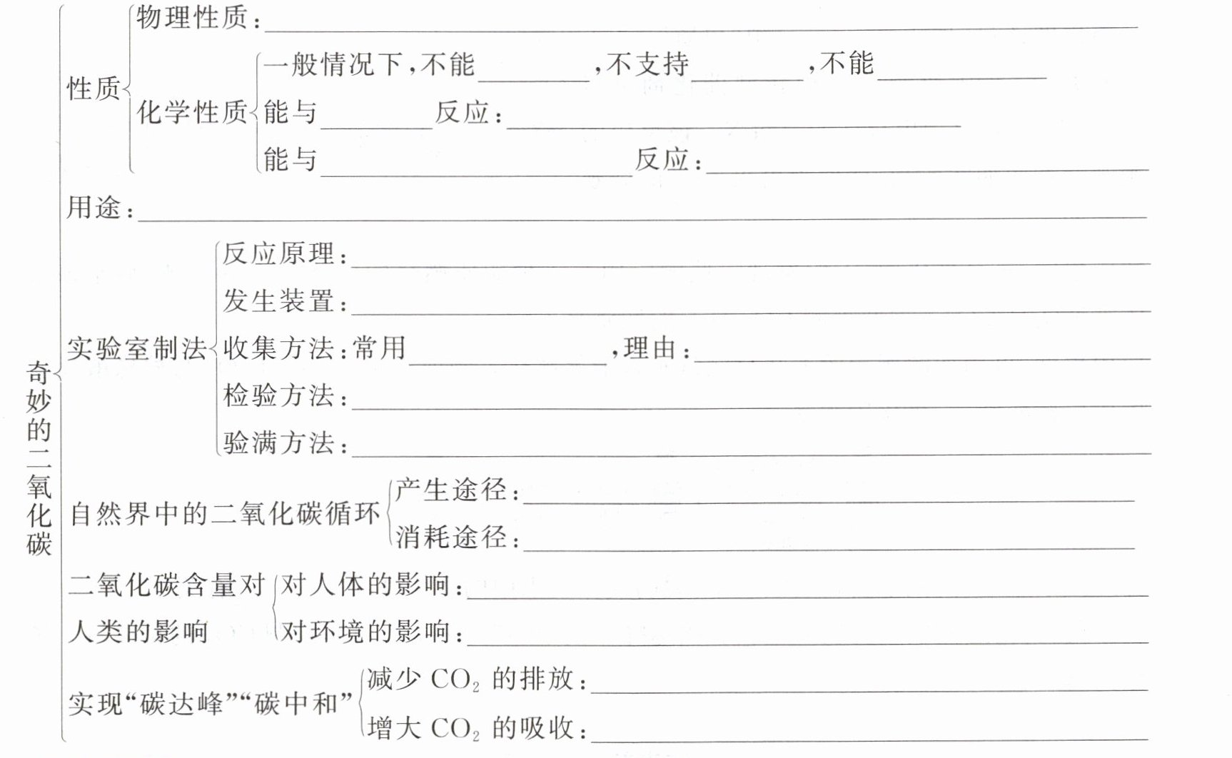 通常状况下,二氧化碳是一种无色、无气味的气体,密度比空气大,能溶于水 燃烧 燃烧 供给呼吸 水 CO₂+H₂O═H₂CO₃ 澄清的石灰水(或氢氧化钙) CO₂+Ca(OH)₂═CaCO₃↓+H₂O 用于灭火;用作制冷剂,用于冷藏食品和人工降雨;重要的化工原料;气体肥料等 CaCO₃+2HCl═CaCl₂+CO₂↑+H₂O 固+液,不加热制备气体 向上排空气法 CO₂的密度比空气大,且不与空气反应 通入澄清石灰水中,若澄清石灰水变浑浊,则证明是CO₂ 将燃着的木条置于集气瓶瓶口,若火柴熄灭,则已集满 含碳物质的燃烧、人和动植物的呼吸作用和微生物的分解作用等 绿色植物的光合作用、溶于江河湖海、与水、氢氧化钙等反应 空气中CO₂含量高,有害于人体健康 大气中CO₂含量高,会产生温室效应 改变能源结构,减少化石燃料的使用 植树造林、捕捉CO₂,将CO₂作为资源