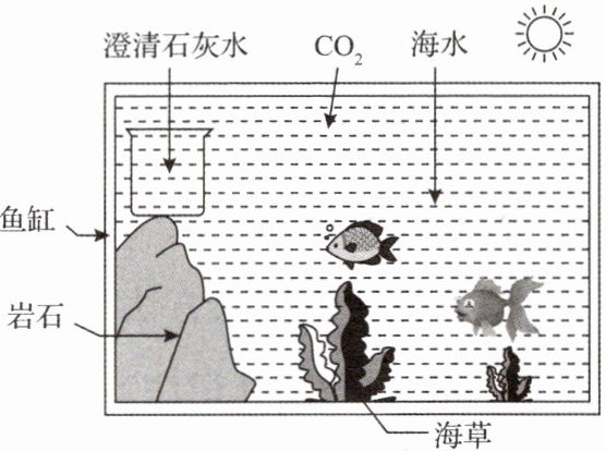 作用参与碳循环。②俊宇向生态箱中通入$CO_{2}$,一段时间后烧杯中出现的现象为