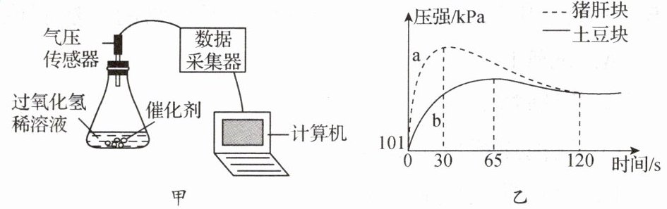 10. 兴趣小组用图甲所示装置探究不同催化剂对过氧化氢分解的催化效果。取大小相同的新鲜土豆块和新鲜猪肝块作催化剂,分别加入 $ 10 \text{mL} $ 相同浓度的过氧化氢稀溶液后,用传感器测量装置中气压的变化,如图乙中曲线 a、b 所示。