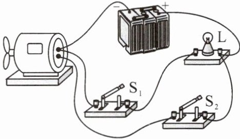 (注:此处需用电路符号画出并联电路,两条支路分别包含S₂-L和S₁-电动机,干路无其他元件。)