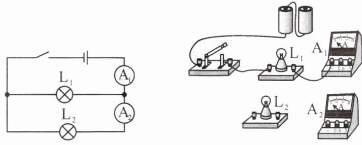 4. 按电路图连接实物,已知闭合开关后,通过$L_1$的电流为0.9 A,通过$L_2$的电流为0.4 A。(连线不许交叉)