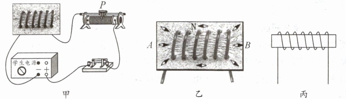 (2)为了进一步探究通电螺线管外部磁场的方向,同学们把小磁针放在螺线管四周不同的位置,闭合开关,小磁针静止时N极所指的方向如图乙所示(涂黑的一端是N极),则此时通电螺线管的A端为____(选填“N”或“S”)极。对调电源正、负极,闭合开关,小磁针静止时N极所指的方向与图乙相反,说明通电螺线管外部磁场的方向与______有关。