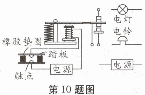 10. 如图所示为一种仓库防盗报警器的部分工作原理图,其踏板放在仓库的门口,电铃和电灯放在值班室内,工作要求:当有人踩踏板时电铃响,无人踩踏板时电灯亮。根据要求,用笔画线代替导线进行电路连接。