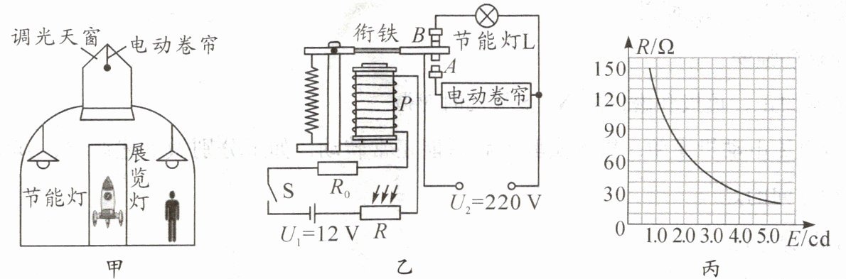 11. 某展览厅(如图甲)为保护展品,设置了调光天窗,当外界光照较强时,能启动电动卷帘适时调整进光量;当外界光照较弱时,能自动启动节能灯光给补光。调光天窗的电路原理如图乙所示:R₀为定值电阻;R为光敏电阻,其电阻值R随光照强度E的变化如图丙所示(E越大表示光照越强,其国际单位为cd);P为电磁铁,其线圈电阻Rₚ= 20Ω,当电流达到0.04A时能吸合衔铁。已知电源电压$U_1= 12V,U_2= 220V,$则: