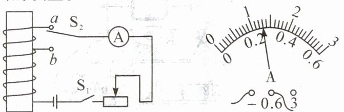 (2)探究线圈匝数对电磁铁磁性强弱的影响时$,S_1$闭合$,S_2$接a处时,电流表示数如图所示,记为