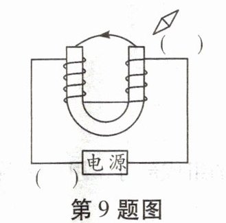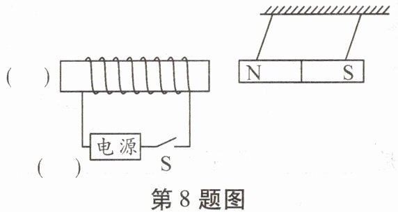8. 如图所示,闭合开关后,条形磁体向左偏。请在括号内标出:通电螺线管左侧的磁极名称和电源的“+”或“-”极。