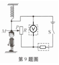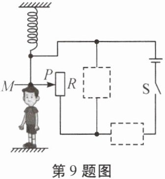 9. 如图丙所示为一身高测量仪的电路图,请在两个虚线框内分别选填:“电流表”“电压表”或“定值电阻”的元件符号,要求被测人身高变高时电表的示数增大。