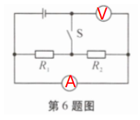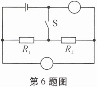 6. 如图所示,试在两个“○”内选填“电压表”和“电流表”的符号,使开关S闭合时两灯组成并联电路。