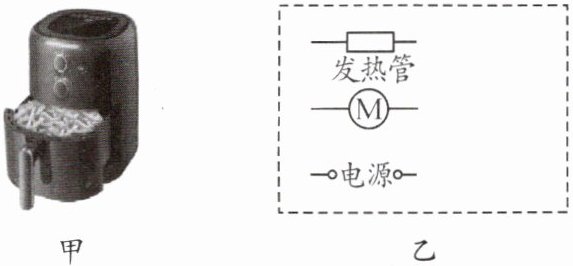 8. 如图所示,图甲是一种时尚的烹饪工具——空气炸锅。使用它时发现:空气炸锅通过两个开关可以让电动机和发热管同时工作产生热风,也可以在加热结束后让电动机单独工作吹冷风给发热管降温,但是不会只发热而不吹风。请在图乙的虚线框内画出两个开关并完成空气炸锅工作的电路图。
