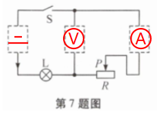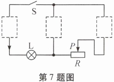 7. 如图所示,将电池、电流表、电压表三个元件符号正确填进电路的虚线框处,要求开关S闭合后电流方向如图所示,移动滑动变阻器的滑片P,小灯L变亮时,电流表示数变大,电压表示数变小。